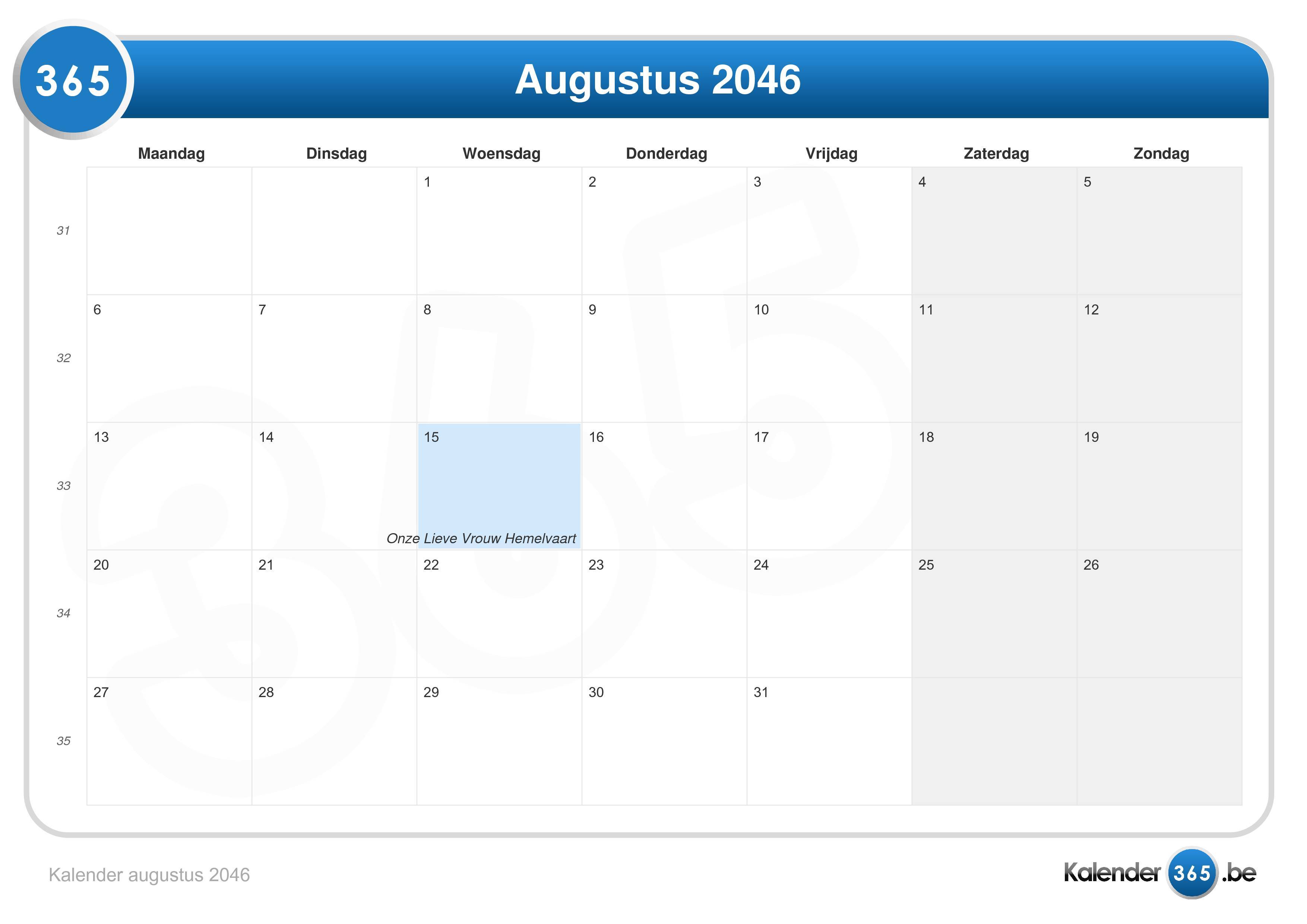 Kalender augustus 2046 (Liggend formaat)Ga naar Kalender 2046.