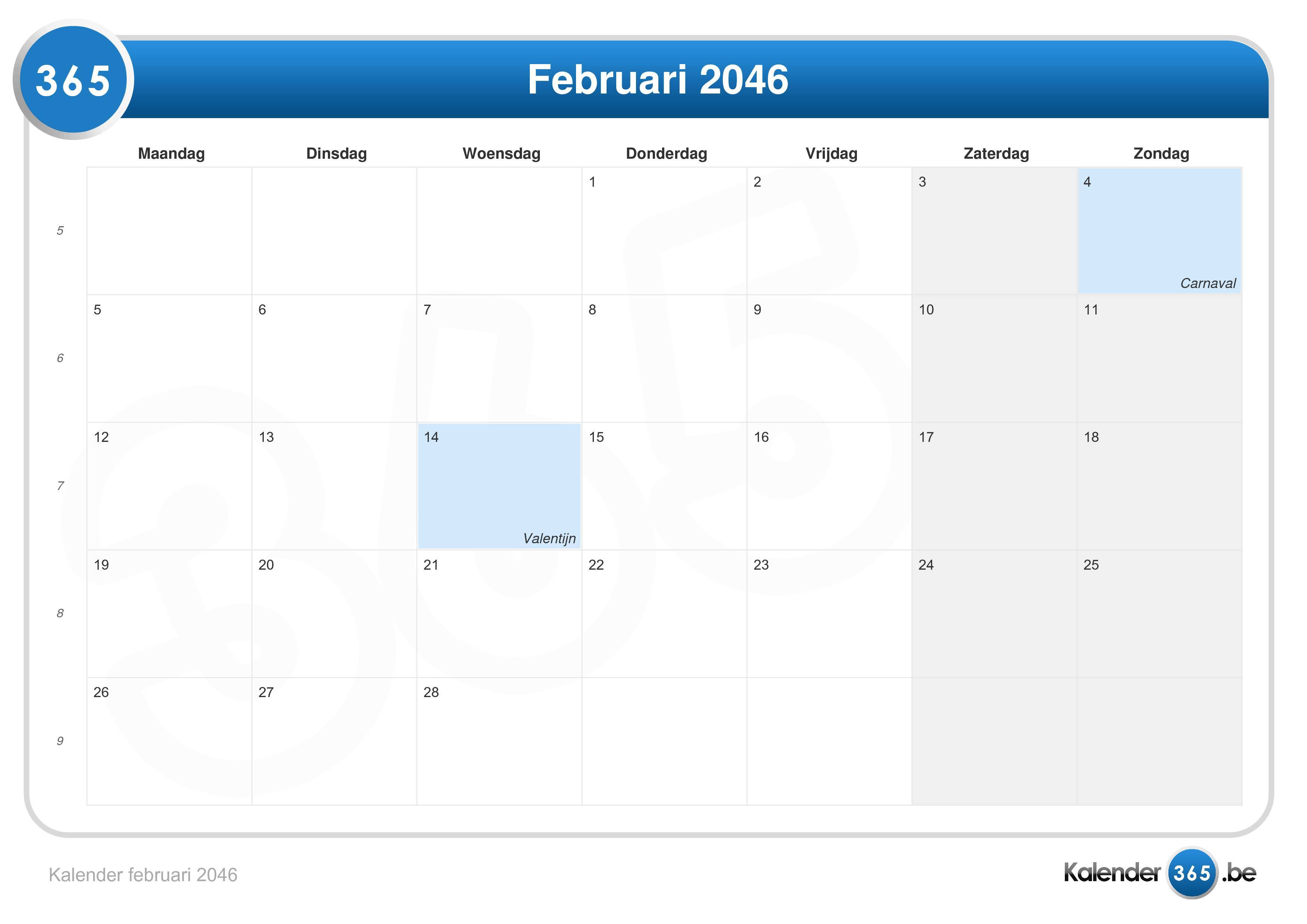 Bekijk hier de maandkalender van februari 2046 inclusief weeknummers.| 4 februari | Carnaval |