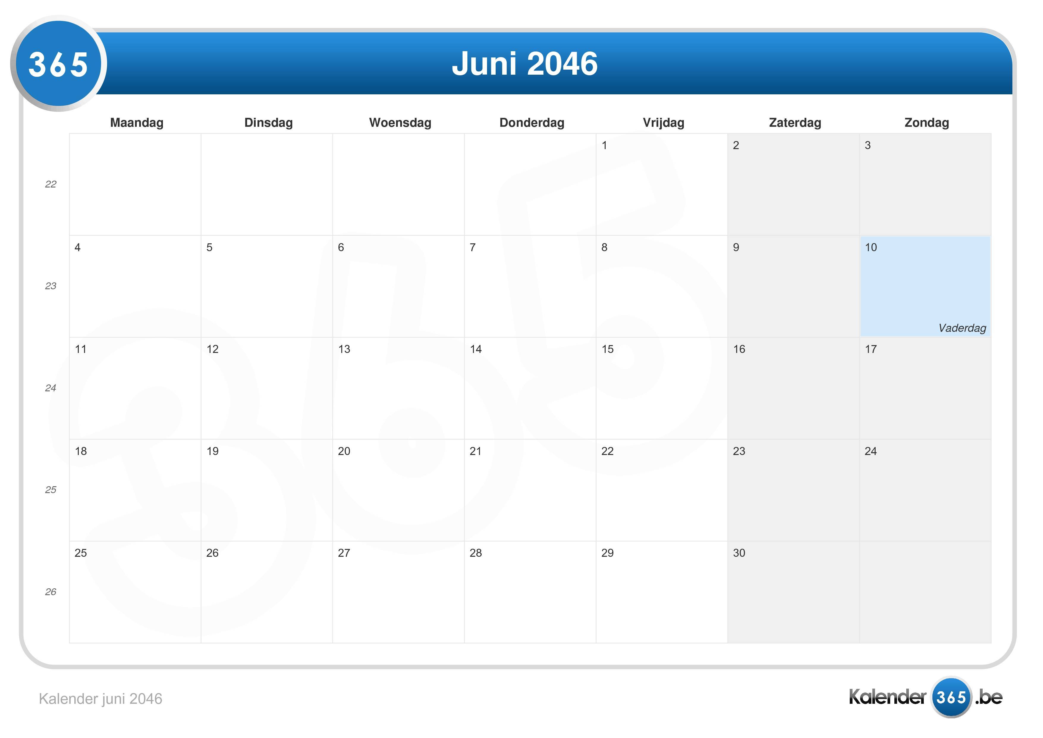 Kalender juni 2046 (Liggend formaat)Ga naar Kalender 2046.